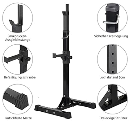【VERSTELLBARE LANGHANTELABLAGE】Kniebeugenmaschine mit verstellbaren Langhantelablagen. Das multifunktionale Design ermöglicht es Ihnen, verschiedene Übungen. Verstärkte Konstruktion sorgt für Stabilität beim Training mit schweren Gewichten. Rutschfeste Füße bieten sicheren Stand und verhindern ein Verrutschen der Langhantel Ständer.